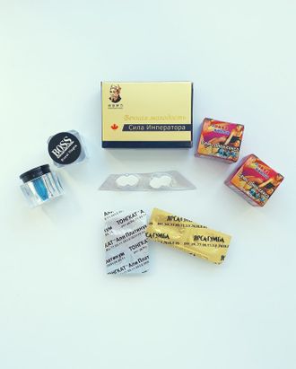 В данном наборе представлены наиболее известные препараты: Тонгкат али платинум ( 2 капс.), Ярсагумба ( 2 капс.), Сила императора ( 2 капс.), Снайпер ( 2 табл.), Boss Royal Viagra ( 2 шт. по 3 капс. = 6 капс.), 7 дней секса ( 2шт. по 2 капс. = 4 капс.) Итого 18 капсул. Данный набор предназначен для тех, кто ни разу не сталкивался с представленными препаратами, либо для тех кто хочет попробовать, подобрать для себя препарат и в последствии заказать курс.
